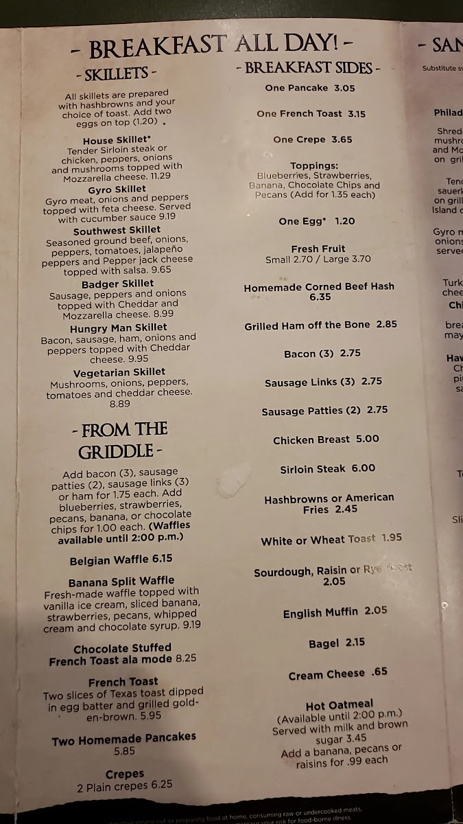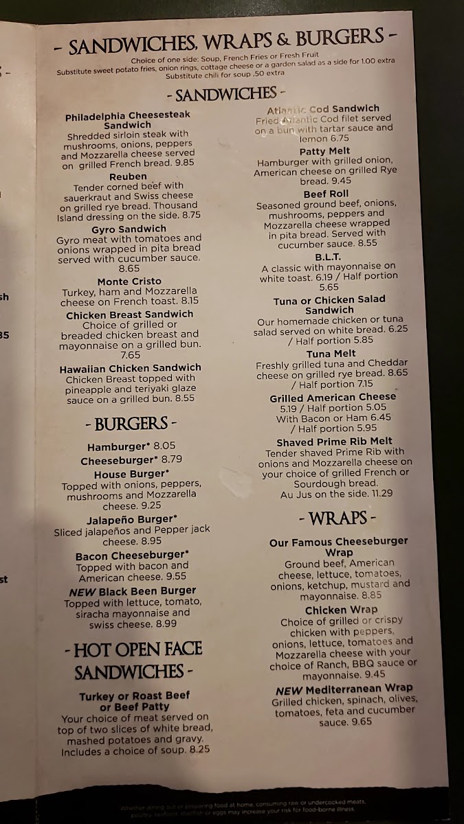 Entrees are served with fresh fruit, a drink, and one additional side: Mary’s Potatoes · Grilled Broccoli · Roasted Broccolini · Asian Slaw · French Fries